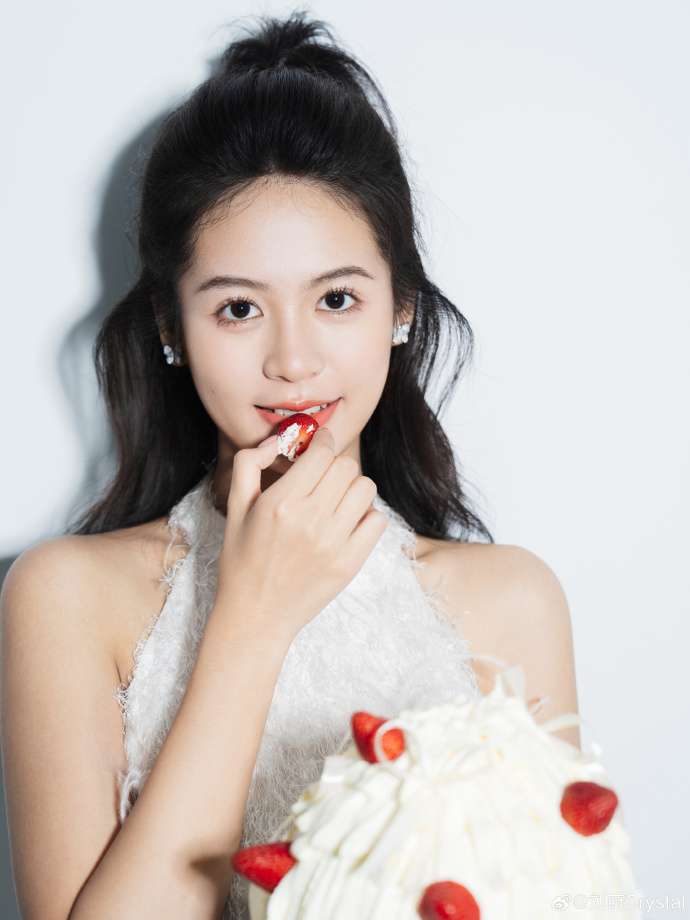 小水晶拿著生日蛋糕上的裝飾草莓各種造型擺不停,無論是集中臉部拍攝,還是遠鏡頭,小水晶的顏值都十分耐看,確實是美得太超過了。