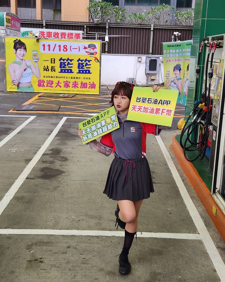 原來這位可愛女員工的真實身份是啦啦隊女神籃籃,她擔任加油站年度代言人,並在18日擔任一日站長,籃籃表示她練習了很多次要怎麼加油,但實際上場還是手忙腳亂,有點擔心動作太慢會被車主瞪,一旁的活動主持人小鹿趕緊安慰:「車主只要看到妳的笑容都融化了,放輕鬆不要擔心。」