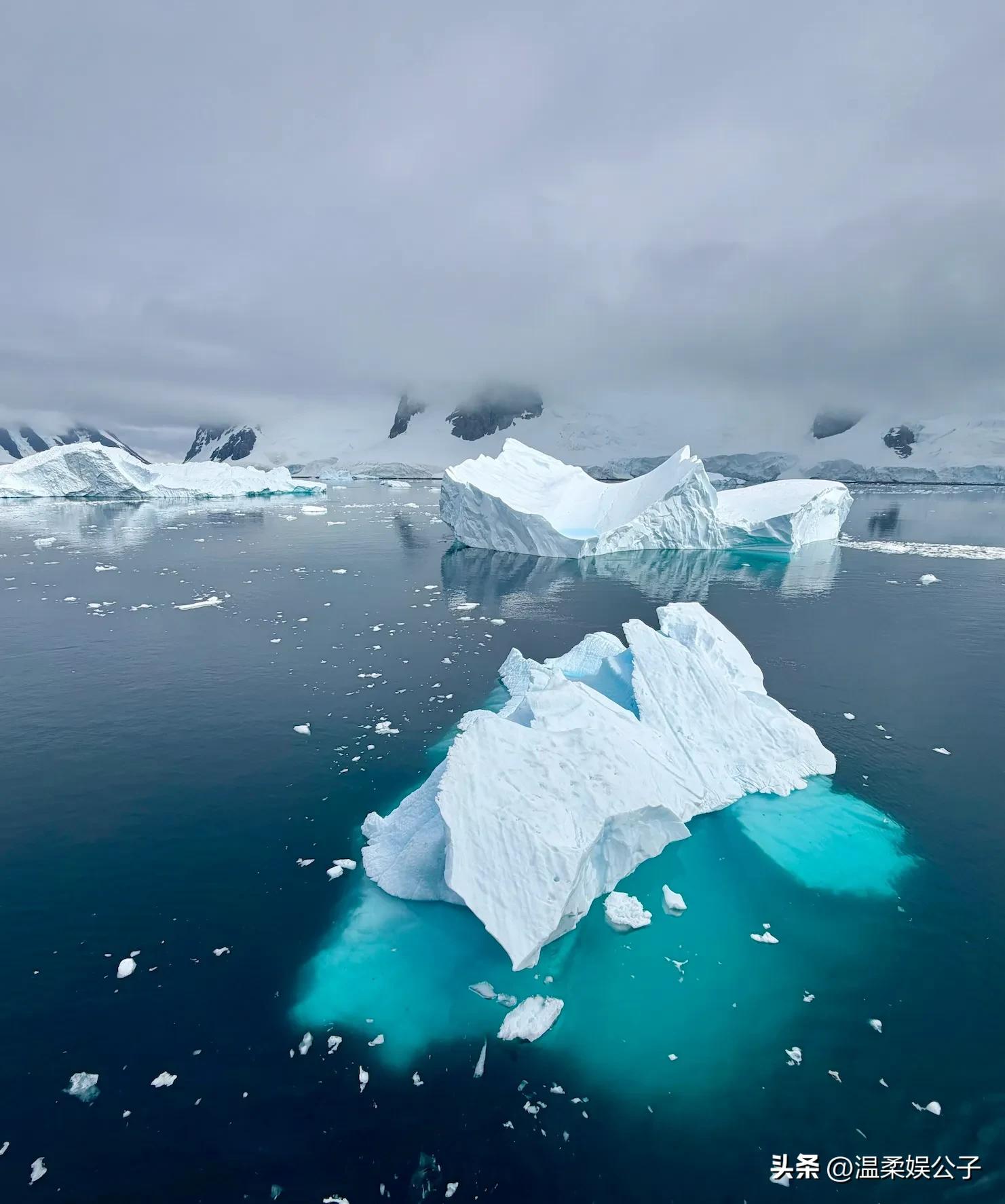 照片中,巨大的冰山傲然矗立在廣袤的冰海之上,在陽光的傾灑下,折射出各種層次豐富、如夢如幻的藍色。