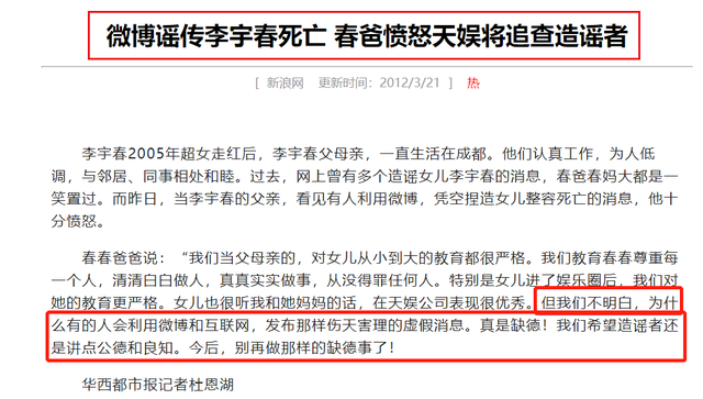 但父母關心女兒,總是不自覺地在網路看女兒的消息,以及網友們對李宇春的評價。有次,父親看到有人說李宇春整形去世了,他勃然大怒,斥責那些編造謠言的人,不講道德和良知。