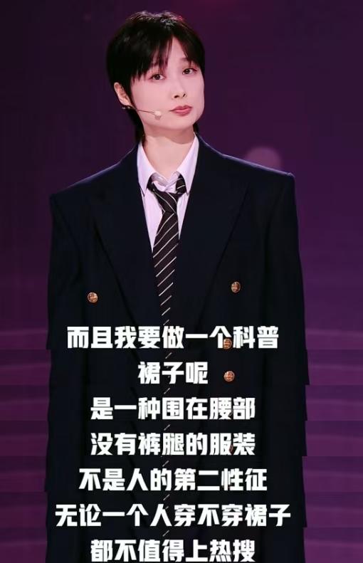 李宇春說,不管裙子還是褲子、都是她自己的選擇,從沒有人在造型上干涉她,而且,在李宇春看來,裙子只是一種圍在腰部、沒有褲腿的服裝,不是人的第二特徵。