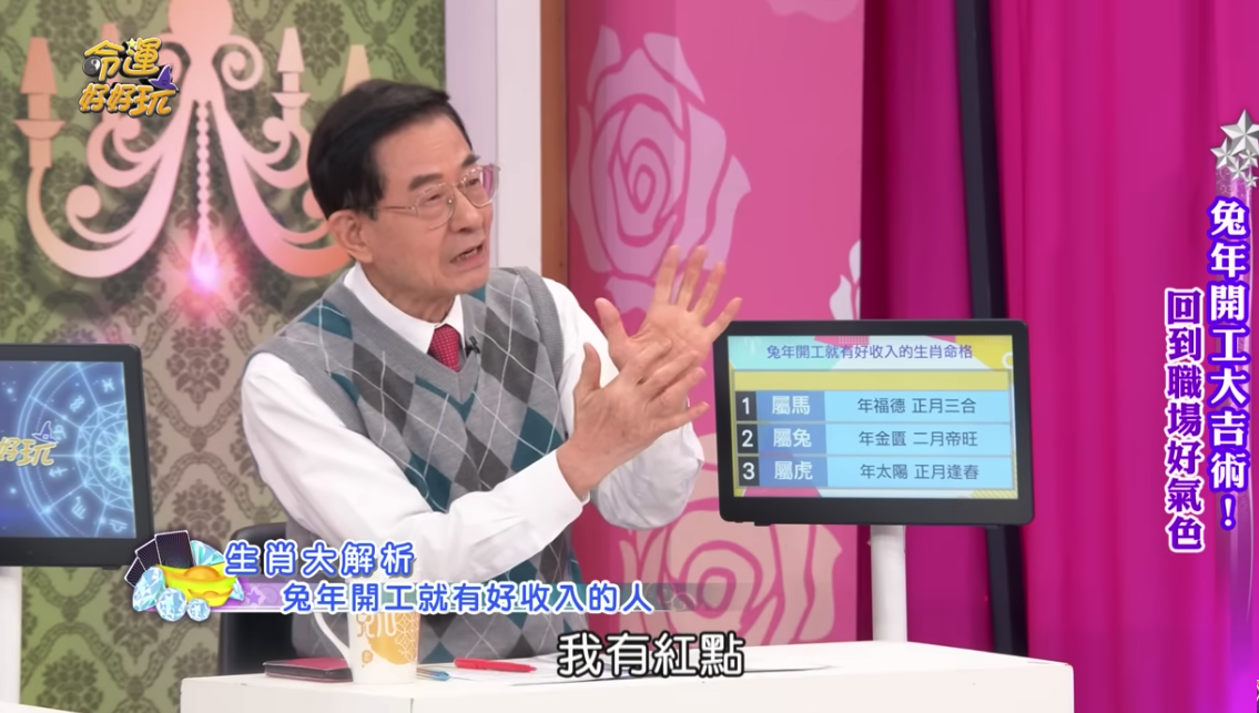 除了三生肖外,黃友輔也分享財神來臨有「3大徵兆」,不管任何生肖都適用!前兩個徵兆和身體有關,呼籲大家早上起床可以檢查手掌中心,若是出現紅點,那就代表財神降臨要趕快接錢;其次則是耳朵,撇除青春期長痘不算,若是感覺癢且耳珠地方長紅痘痘,豎起拇指直呼:「代表財神爺來了,要拿錢送給你!」