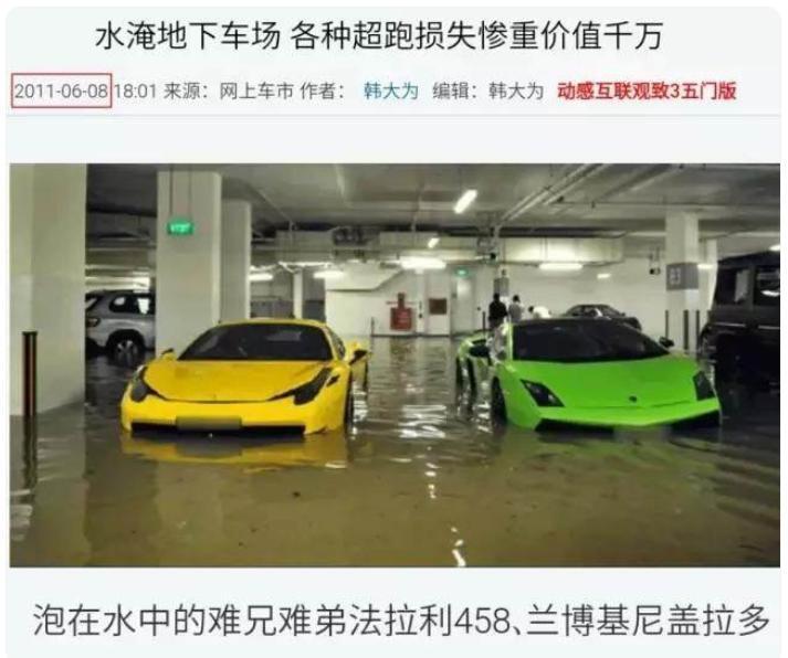 還有他曬出的「跑車淹水」圖片,也是盜用新加坡一場停車場事故的照片…