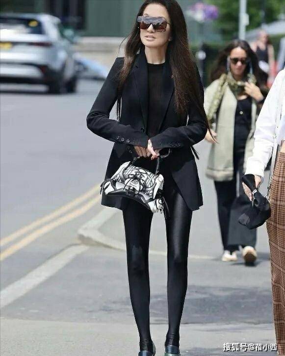 再看這一套街拍搭配,王薇薇的上衣內搭選了件黑色透視針織打底衫,輕薄的面料貼在身上,隱約露出肌膚卻不顯得輕佻,反而用 「半透」 的細節打破了全黑的沉悶。外面疊穿的黑色西裝是點睛之筆,寬鬆的版型剛好蓋過臀部,墊肩襯出利落的肩線,袖口的紐扣特意解開兩顆,露出一小截手腕,讓硬朗的西裝多了點隨性的鬆弛感。這種「鬆與緊」的平衡,是她穿搭裡的小心思,藏住了清瘦的身形,又不顯得拖沓。