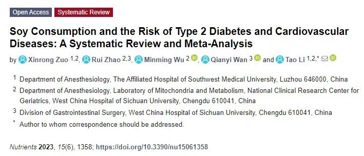 2023年,《Nutrients》雜誌上發表的一篇研究顯示,較高的大豆攝入和糖尿病、心血管疾病、冠心病以及卒中風險降低17%、13%、21%、12%有關。