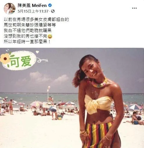 根據《Yahoo奇摩新聞》報導,一直樂於分享美照的陳美鳳,日前分享過去「秀場女王」時期照片,自曝「黑」歷史,有別於大家一白遮三的觀念,當時同時代的美女皮膚都超級白,但她就是白不了,於是轉念反其道而行,既然白不過就曬黑!照片中的她穿著性感泳裝,高衩設計讓蜜臀若隱若現,黃色的泳裝也襯托出她健康的小麥色,反而讓她秀場接不完,封為女神當之無愧!