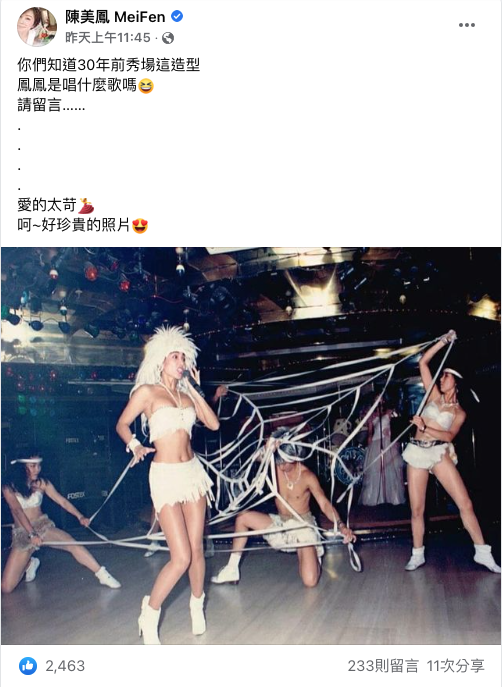 台灣早期「秀場時代」曾造就許多傳奇藝人與經典表演,被封為台灣演藝圈的「黃金年代」!以下這是一張珍貴的「秀場舊照」,最近一位女藝人翻出30多年前的秀場表演照,前衛又火辣的造型放在現代看來也毫不違和,立刻引起網友熱議!