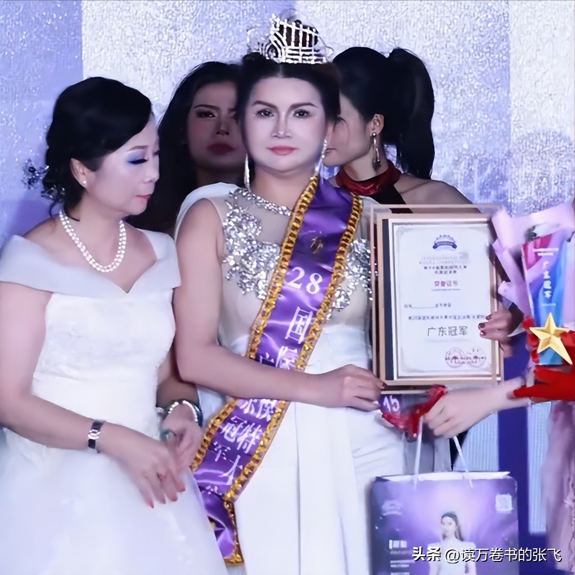 影片裡一位看起來年紀不小的女士,頭上戴著桂冠,身上披著冠軍綬帶。