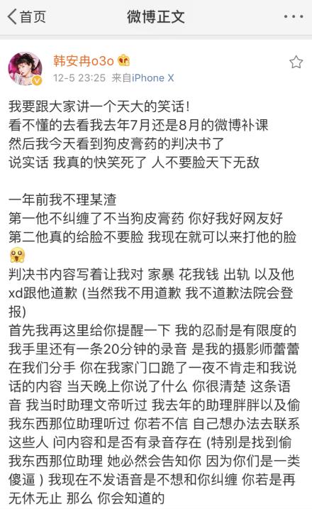 面對指責和謾罵,韓安冉堅決否認,還揭露馬文超的種種「惡行」。