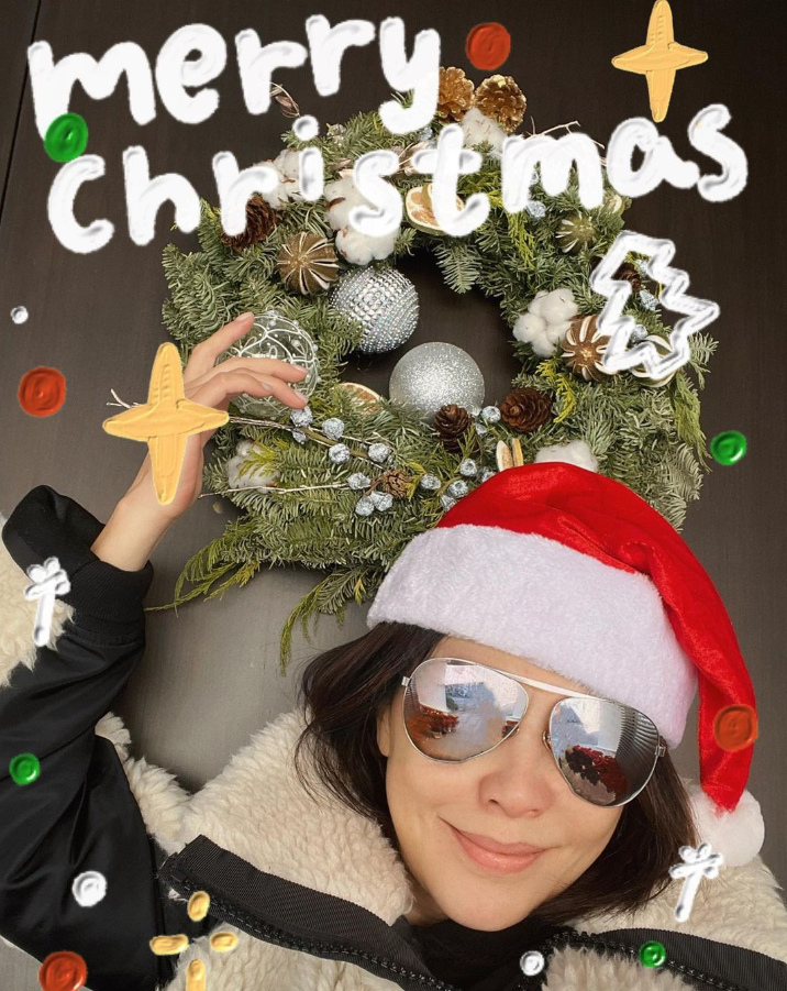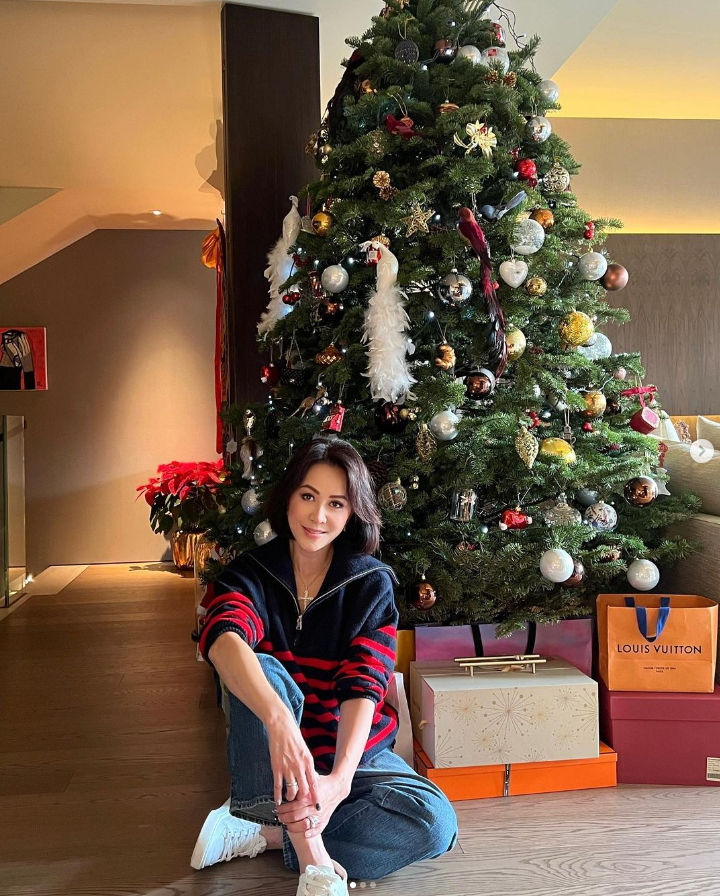 另一張則是她自在地席地而坐,身後是氣派的假壁爐與華麗的聖誕裝飾,搭配上白蠟燭,滿滿都是耶誕氛圍感,而除了奢華家具外,還擺放不少劉嘉玲美照!