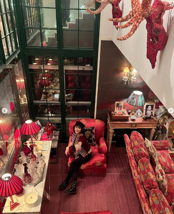熱愛社交的劉嘉玲,於1995年購入市值約為港幣9,800萬(約新台幣3.85億)的「梅苑」,用來招待朋友,也是夫妻倆最常曝光的豪宅,只見豪宅走復古華麗風,以紅、綠色為主要配色,東西方風格結合,洋溢著濃厚的耶誕氣氛,而從她上傳的一系列照片中可以見到,她上身穿著一件聖羅蘭紅色夾克,坐在暗紅色祥雲印花沙發上舉杯,視角似乎是從家中二樓往下拍攝,整體裝潢相當氣派奢華!