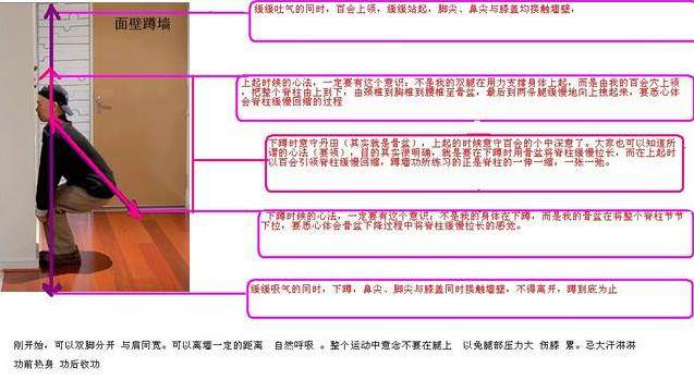 腳尖觸牆,面壁而立,眼睛微閉,雙肩稍微內扣,鼻子輕觸牆,雙膝微觸牆。緩慢下蹲(吸氣),將氣徐徐吸入到下丹田(臍下),直至臀部觸及腳後跟,吸氣停止,起立(呼氣),依舊是緩緩呼出,徐徐起身。之前給大家說的比較零散,這次給大家進行了詳細的分解!
