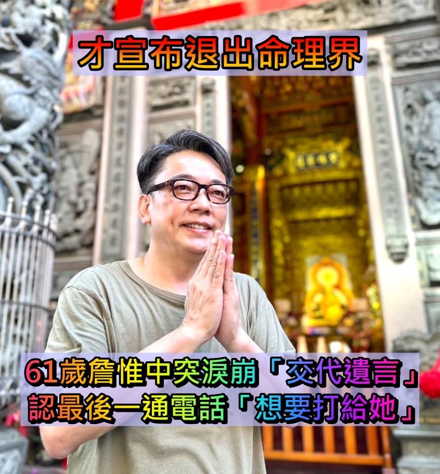 才宣布退命理界!詹惟中突淚崩「交代遺言」 最後一通電話「想要打給她」 檸檬塔好酸 2026-02-05 檢舉 圖片來源:詹惟中臉書這場突如其來的父女對話,不僅化解多年來隔閡,也讓在場所有人見證了一場動人的親情告白。最後,詹惟中也感慨交代後事、訴說遺言,並特別提出兩個請求,希望女兒能為他燒紙錢,就算她身為基督徒,也可請人代勞;另外,他期盼粉絲能為他助念,只求走後能前往好的世界。圖片來源:詹惟中臉書參考來源:中時電子報 Advertisements 回首頁 2/2 Advertisements 猜你會喜歡 多年風評破功!61歲詹惟中算命「收5800只聊13分鐘」 女顧客怒發文「控訴完全不準」:覺得被騙了... 差點認不出來!詹惟中「突消瘦9kg」認了惡疾纏身 遭醫生警告「嚴重恐截肢」:為了女兒努力活著 編輯精選推薦 More + 以為只是小感冒!本土女星悲痛證實「他併發肺炎過世」 一度淚灑現場「後悔同意插管」 最新/賈靜雯深夜慟曝「她已離世」 淚PO合照喊:真的好愛你... 晚年隱居台東!68歲名主持失蹤「車內身亡」 伴侶悲曝「死前做1事」:還掛念著我 大咖男星妹妹出嫁!全身金飾「曾獲近千萬豪宅」嫁妝豐厚 兄妹長超像「一看媽媽懂了」:基因強大 離婚18年!前夫早知方文琳罹癌「願意付手術費」 「1理由遭拒」爆她術後狀況 台語歌后慟別摯愛!告別式上認「早隱瞞病情」 道歉哭喊:原諒我簽放棄急救 李英愛輸了!73歲富商尪「超凍齡像40壯年」站一起超登對 「不時甜蜜咬耳朵」網羨慕 功德圓滿了!台語歌后「悲曝他離世」享壽95歲 淚喊:去當快樂的神仙吧... 22歲愛女病逝!資深男星「走不出喪女痛」留白長髮現身 掛骨灰項鍊「代女做1事」惹淚 當年親吻1歲嬰!42年後「對方竟成巨星」同框劉德華 「超高顏值如兄弟」粉絲喊:真的差19歲? 弟成植物人、姊猝逝!玉女歌手「遭前夫設套」騙走娘家房產 「狠斬16年婚姻」近況曝 本土劇女星生了!7年前凍卵「終於來到我身邊」 歌手尪嗨喊:生個足球隊 空窗多年!68歲陳美鳳突羞認「身邊有個他」 40年前就認識「遭男方母親拆散」 迷你版公主超Q!馬麻幫女兒「扮成迪士尼公主」爆紅 私下照曝光「精緻可愛白皙小臉」正面美翻❤️ 曾比江蕙紅!台語歌后「爆未婚生子」遭指指點點 「2次手術害癱瘓」72歲近況曝 慶祝17歲愛女畢業!53歲大咖「兒女皆讀名校」年花千萬 驕傲「她獲三大獎」:又美又自信 趕在40歲前閃婚!八點檔女星「宣布嫁給他」 尪驚人身分曝「媒人是柯叔元」 快養不起小孩!本土男星「開計程車、斜槓房仲」 突宣布「離開台灣」:演藝圈沒工作 旅美多年!資深女星「堅持落葉歸根」回國5天安詳離世 死前「砸600萬做1事」眾人淚目 24歲兒失明!于美人爆「他在飯店掃廁所」維生 不盼紅包只求「別再花我的錢」 15歲兒「睡夢中離世」!本土女星「送愛子火化」求做1事 「PO照圓滿了」:媽媽和你永不分開 台灣大咖病逝「享壽83歲」!周遊告別式痛哭「認婚內出軌」:兒子很恨我... 再婚2年了!43歲李燕突喊「當媽媽實在太辛苦」 認「已經有愛的結晶」:最完美的幸福❤️ 晚年兒孫滿堂!73歲影壇大哥「拄拐杖現身」腳步蹣跚 兒子「全程攙扶不喊累」網羨:又帥又孝順 婚變尪落跑!單親媽「獨扛千萬債養孩」到處躲黑道 「一開口驚艷眾人」熬成台灣歌后