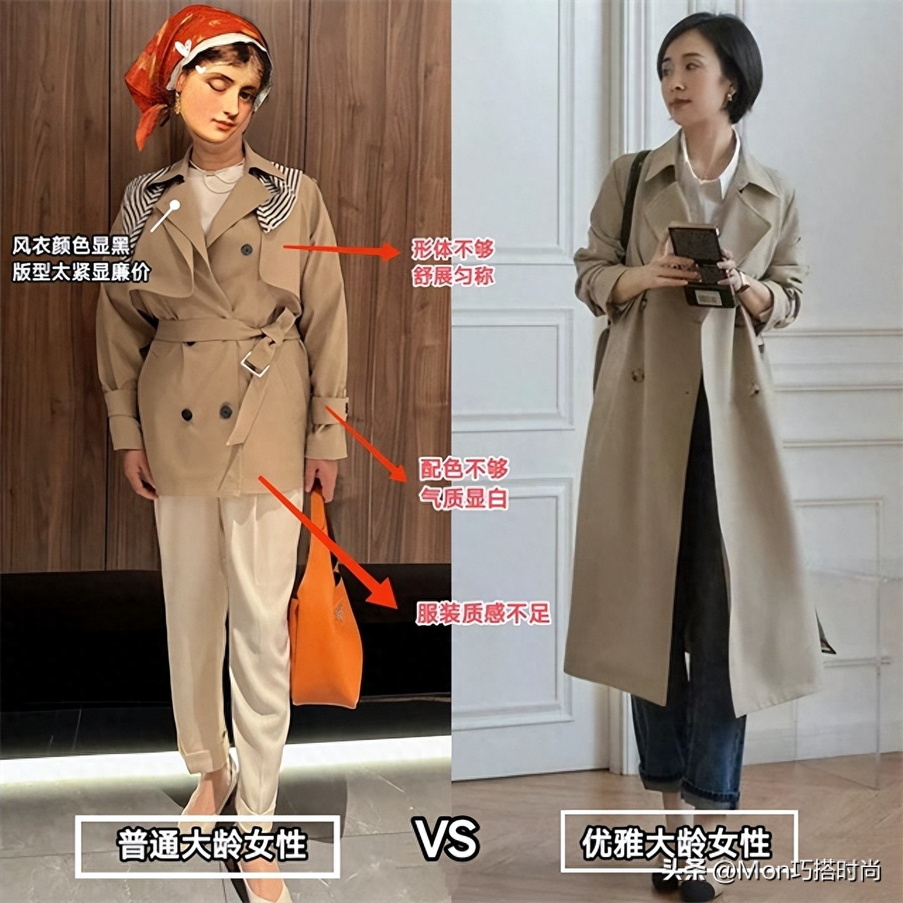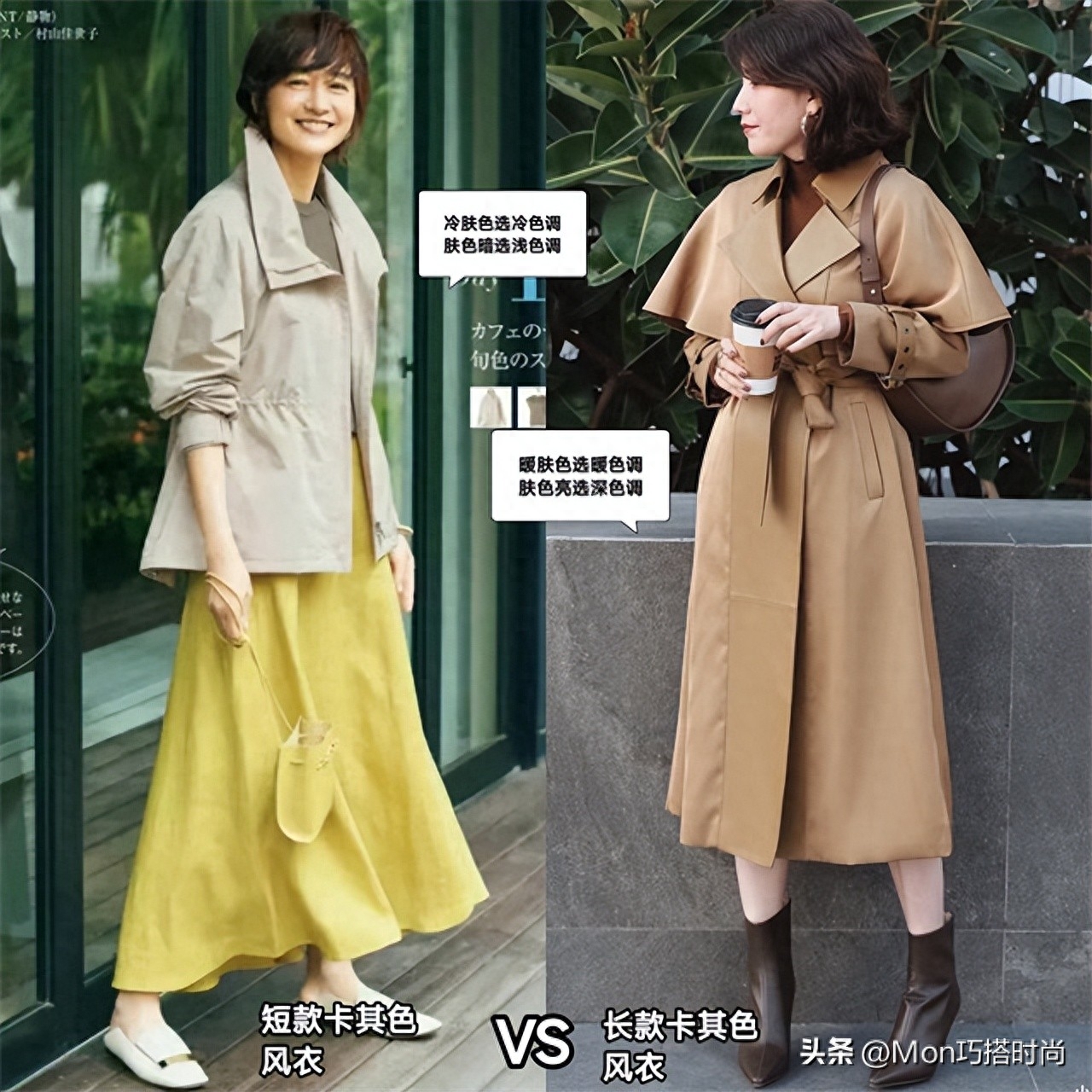 大齡女性穿經典的卡其色系風衣足矣。冷膚色就選帶藍綠色調的冷卡其色;暖膚色適合暖色調;膚色暗要選淺色提亮;白皙透亮的膚色穿深卡其色反而更有質感喲~