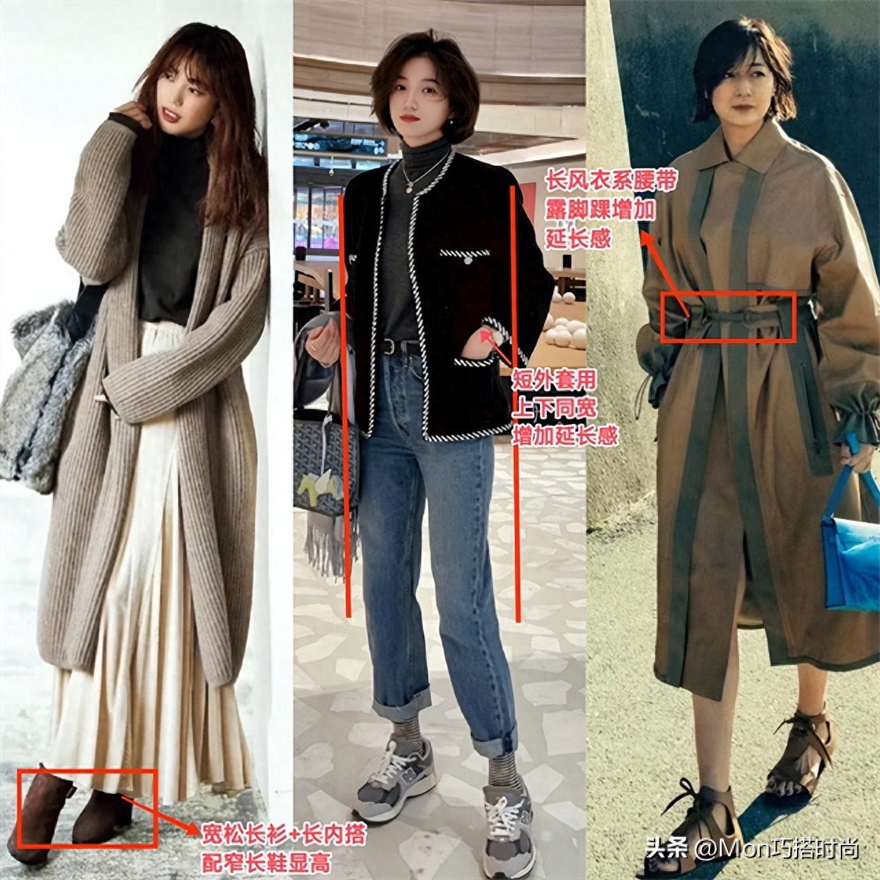 長直線的穿衣輪廓+纖細的關節點是最佳組合。正肩短外套就上下同寬穿;素色長衫+窄長內搭+窄長鞋即可;長風衣記得繫上腰帶,通過高跟鞋、裸靴等適當露腳踝。