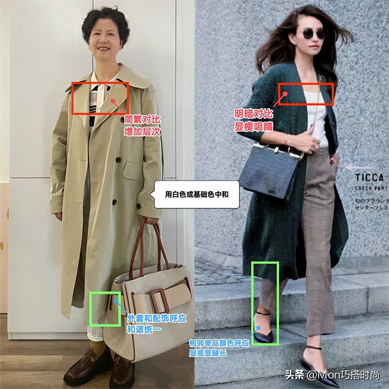 黑白灰棕適合作為中和色過度;對比則以簡繁對比、深淺明暗對比居多。「呼應」的玩法就更多了,相鄰單品呼應顯高,有間隔的單品呼應則和諧。