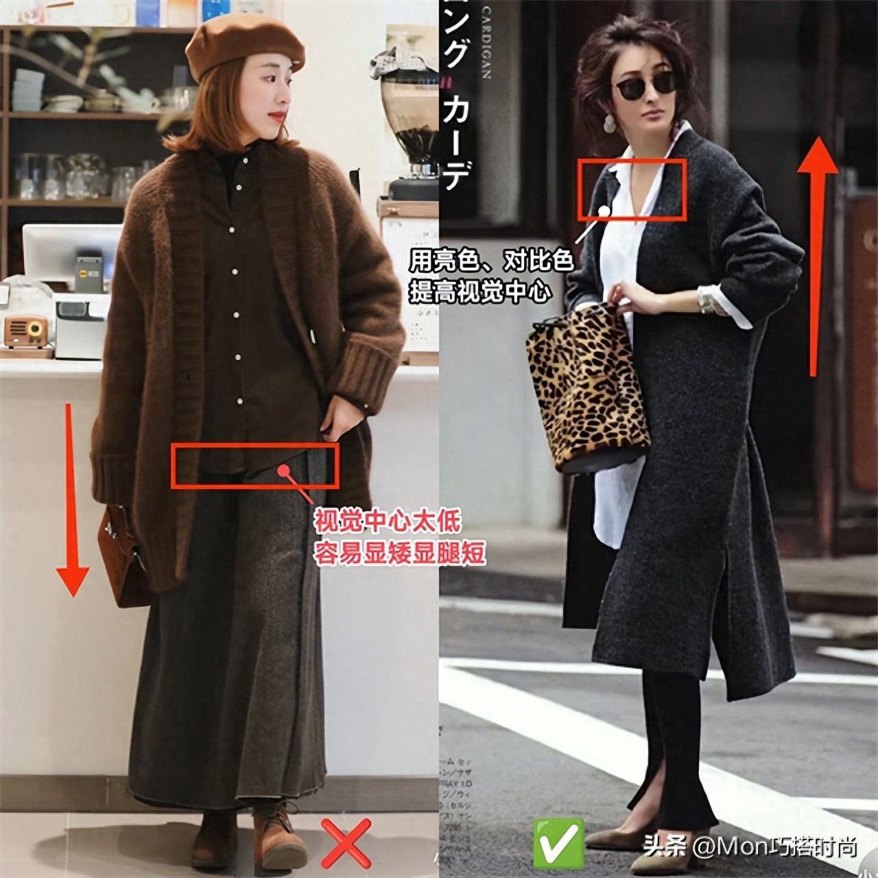 但如果大齡女性選全身暗色,腰線低且上松下松、上長下長搭配的話,不僅顯矮顯胖,還異常邋遢,千萬別這麼穿!