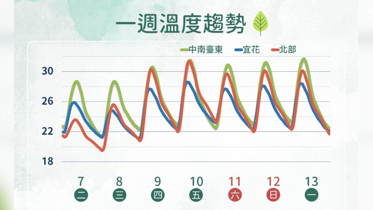 另外,預估本週五在關島東南方附近,今年第4號辛樂克颱風約有5至6成機率生成。賈新興指出,該颱風行進路線應該會朝沖繩方向前進,對台灣不會造成太大影響,但仍需持續追蹤關注後續動態。民眾未來一週可把握晴朗好天氣,但也要注意做好防曬與補充水分。