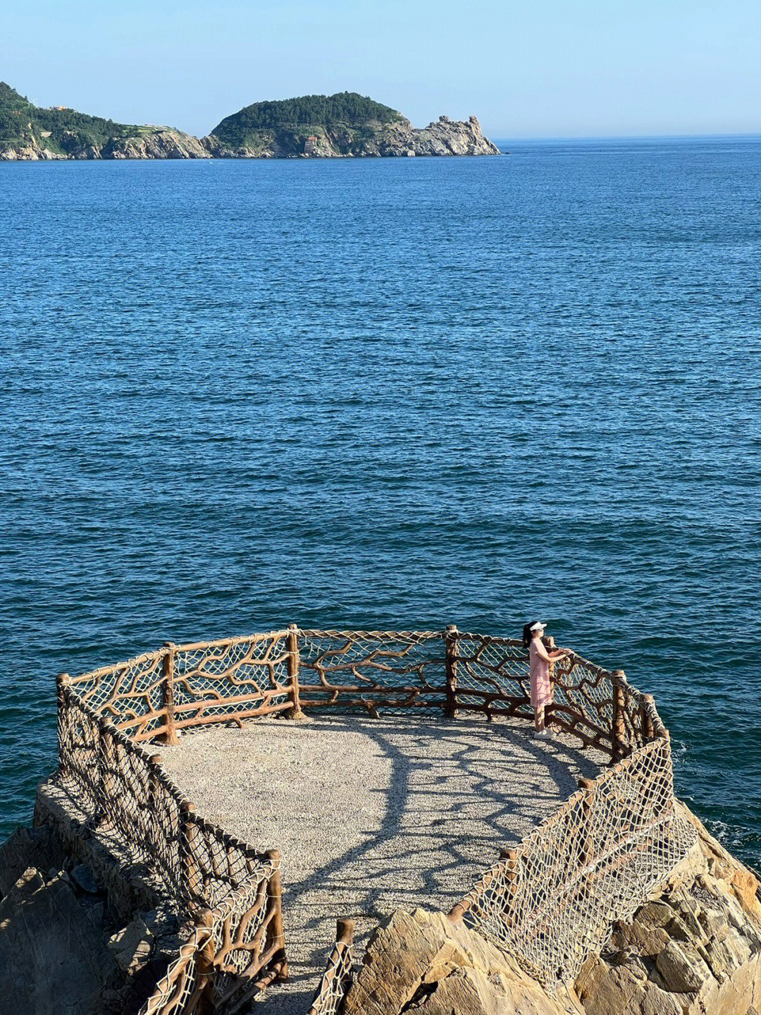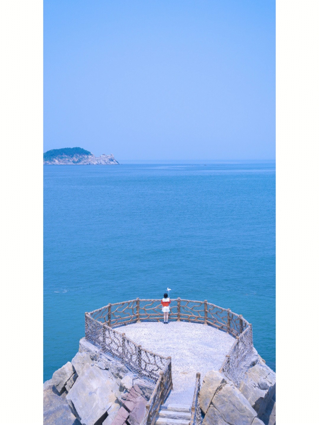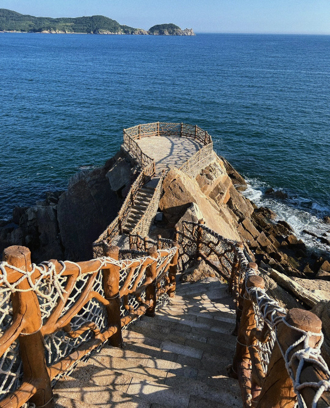 位於中國山東省威海市的貓頭山有著超可愛的外型,遠遠望去就好像一隻趴在海面上的貓咪,而這個一號觀景台就是最適合拍照的打卡點啦~從高處的階梯往下看去,佇立在岩岸上的圓形觀景台欄杆上纏繞著麻繩,就像是船隻的甲板一樣!