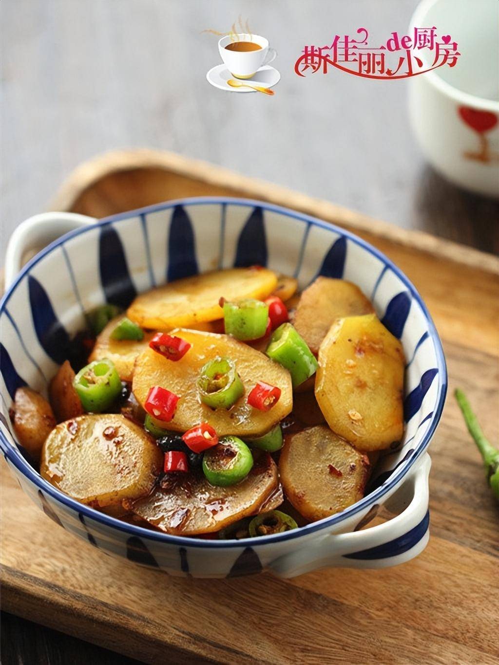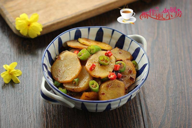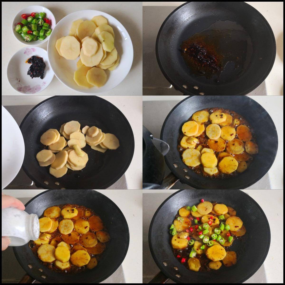 2. 加入馬鈴薯片進鍋翻炒幾下,加入1勺生抽和少許水燜上兩分鐘;