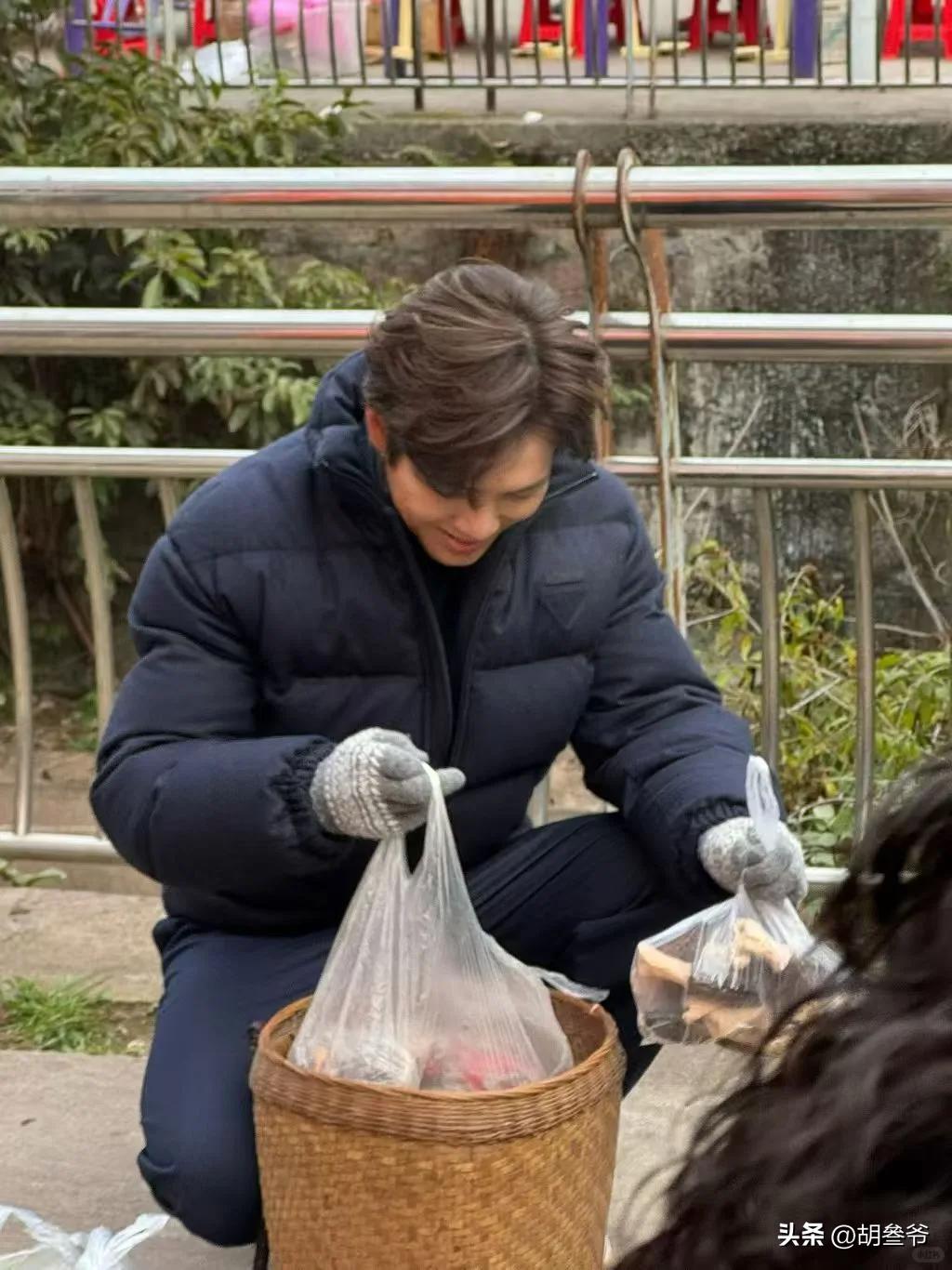 他低著頭,頭頂的白髮藏不住,手上戴著厚厚的手套禦寒,那樣子就像一個普通的小老頭,幾乎看不到沒有任何明星氣質了。