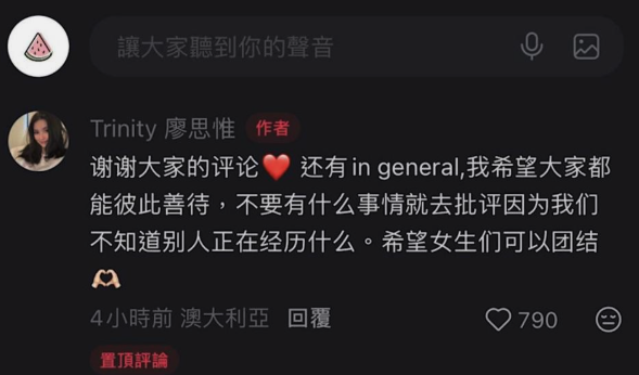 事實上,自從去年未婚產子的消息被媒體披露後,廖思惟的私人生活便成為焦點,就連過去交往過的對象都被網友們挖出來討論,甚至被酸感情世界複雜、戀愛腦。腎只有人在她的發文下方留言:「以後不要戀愛腦啦」,對此她也罕見正面反擊:「我希望大家都能彼此善待,不要有什麼事情就去批評因為我們不知道別人正在經歷什麼。希望女生們可以團結」