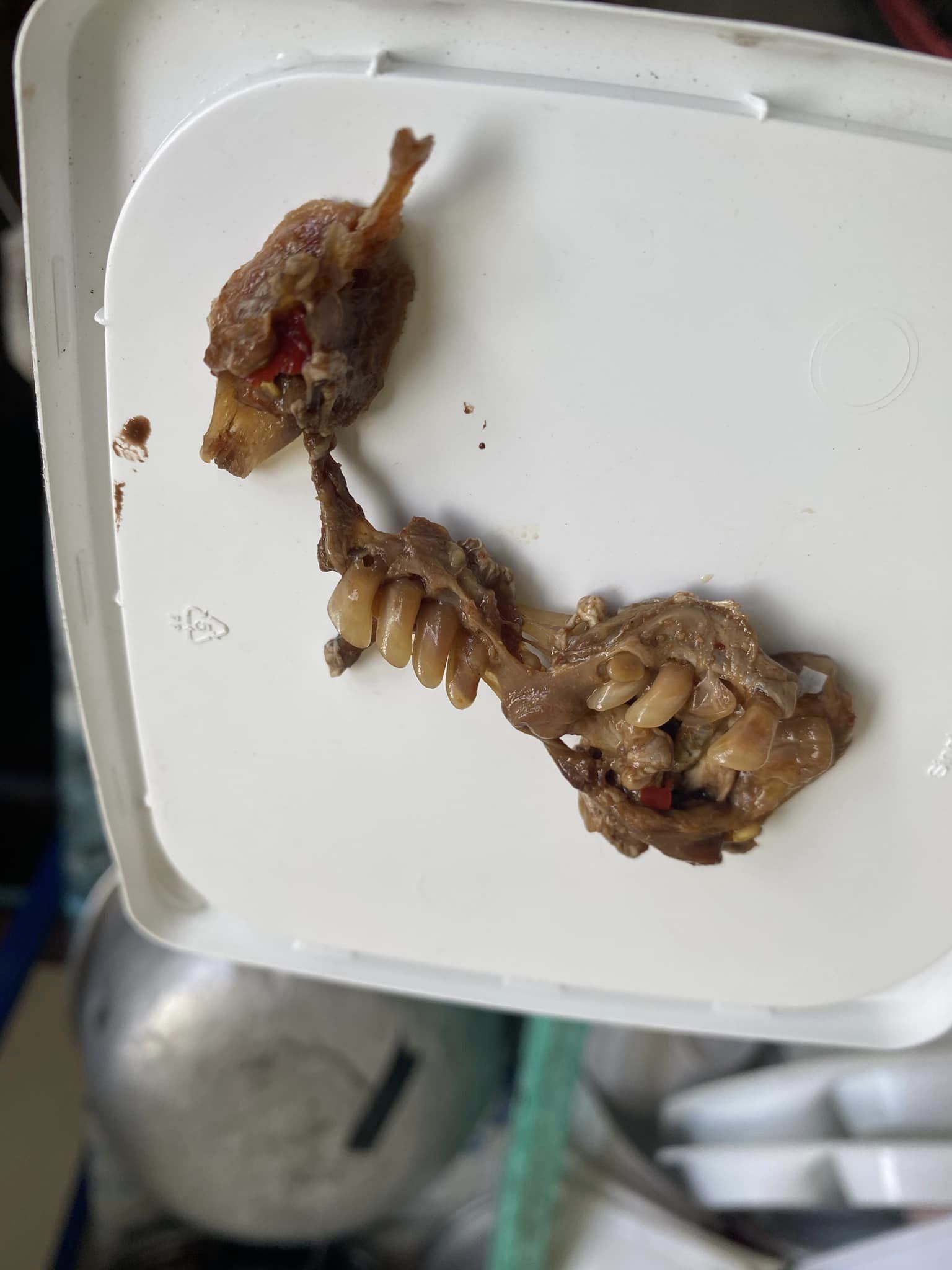 這個詭異發現讓女子瞬間反胃作嘔,她在貼文中懊惱地表示:「這到底是什麼東西的骨頭?我還要吐多少次才能把胃裡的沙拉全吐光?」雖然她試圖說服自己可能是發酵魚的骨頭,但一想到魚類通常不會有這種牙齒,就更加困惑且恐慌。為了解開謎團,她將「帶牙骨頭」的照片分享到網路上,但這次的用餐經驗已經讓她對最愛的發酵魚青木瓜沙拉徹底失去食慾。