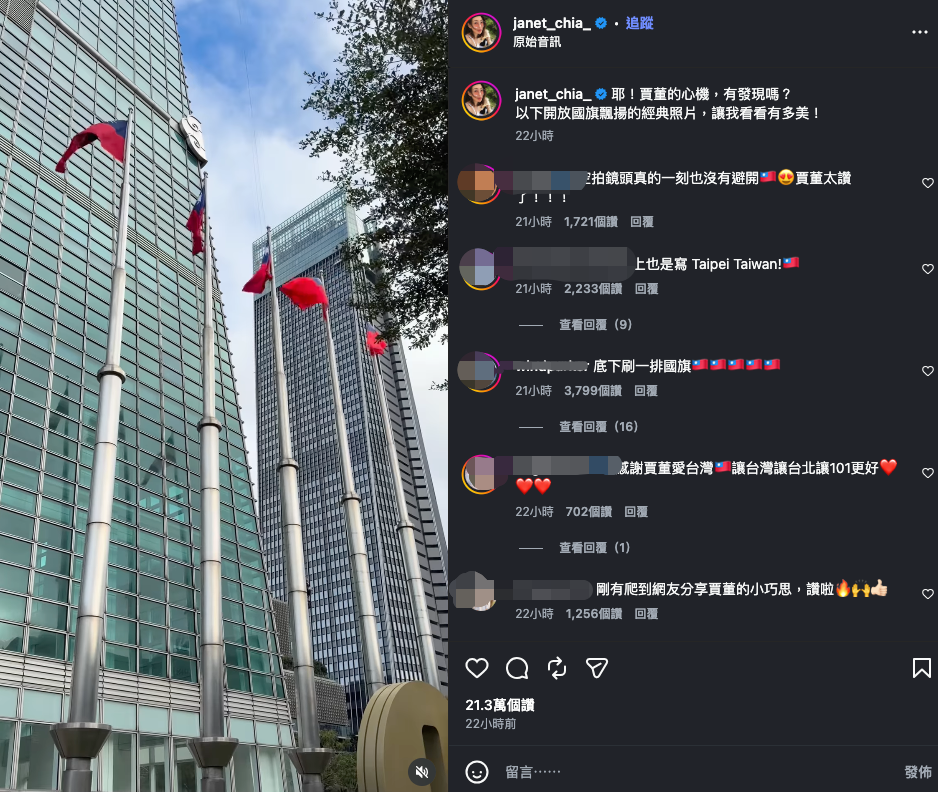 事實上,這次挑戰過程中,賈永婕也暗藏「巧思」,她透露,在挑戰開始前,就已經將101周圍旗幟改成國旗,也透過全球直播公開放送,讓各界看到台灣,「怎麼樣都可以拍得到,怎麼樣全世界都看得到」。