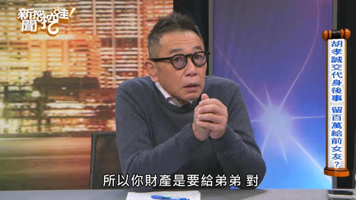 提到為何要將遺產留給前任,胡孝誠說明,當年和那位女友交往時間相當長,雙方早已像家人般親密,因此決定留大約100萬台幣給她,「她不用知道,她的帳戶我清楚」。至於告別式的安排,他已找好禮儀業者小冬瓜負責處理,強調流程要快速簡單,並選擇樹葬方式讓自己回歸大自然。