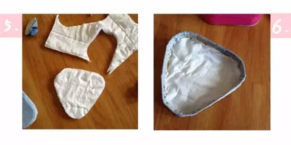 4.把兩片紙盒用膠帶粘起來用作蓋子,縫好的布料翻過來,再把紙盒與布料縫一起