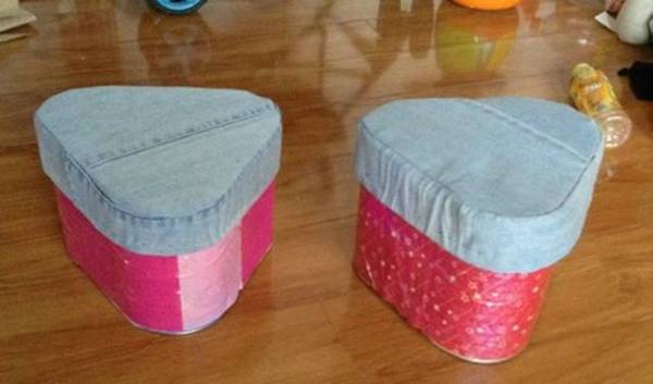 你需要準備:三個奶粉罐,牛仔褲,紙盒,一個紅色塑料袋,針線、剪刀、膠帶