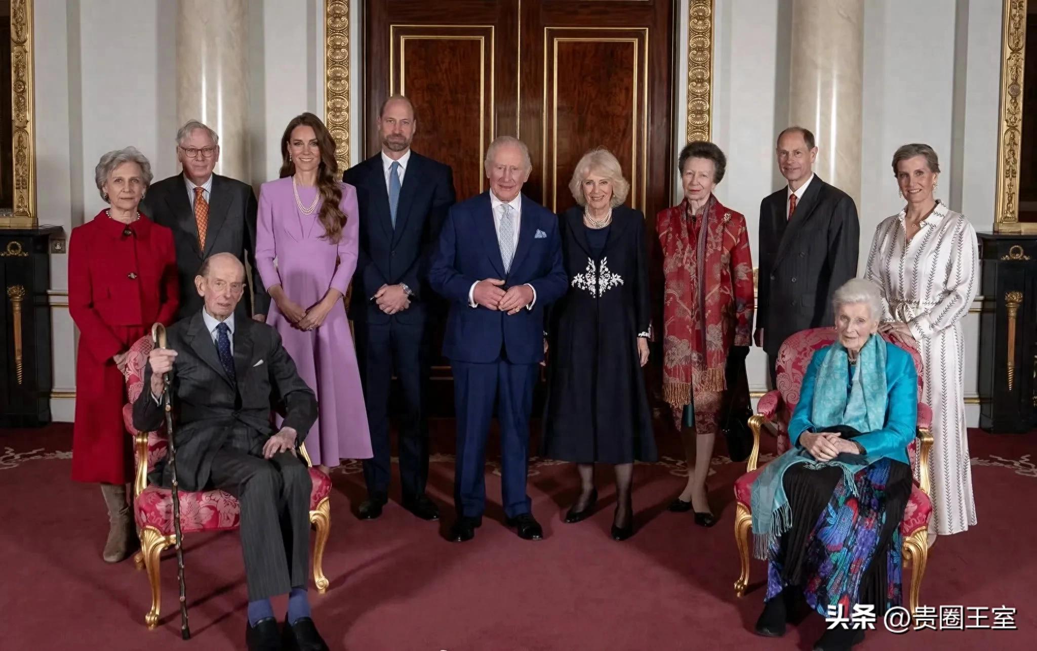 當地時間4月21日,英國王室成員一同亮相白金漢宮參加招待會,以此紀念伊麗莎白女王百歲冥誕。