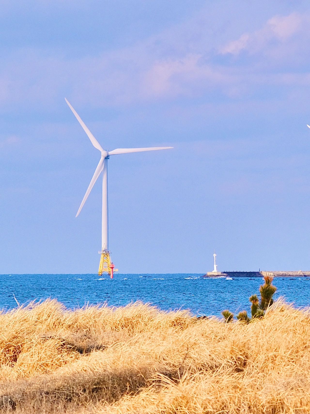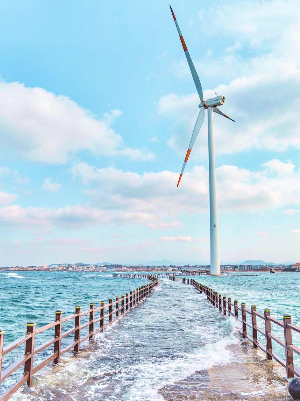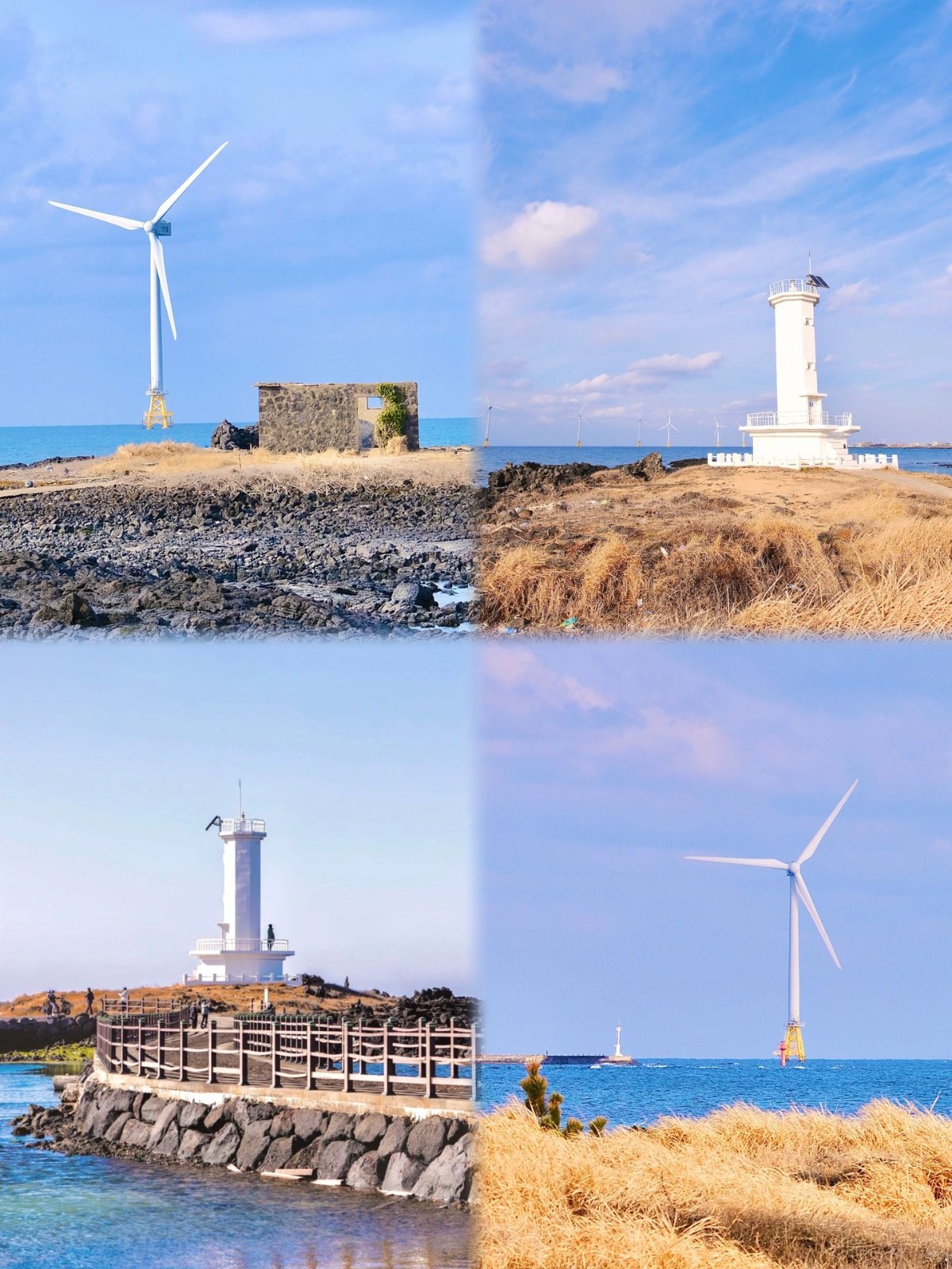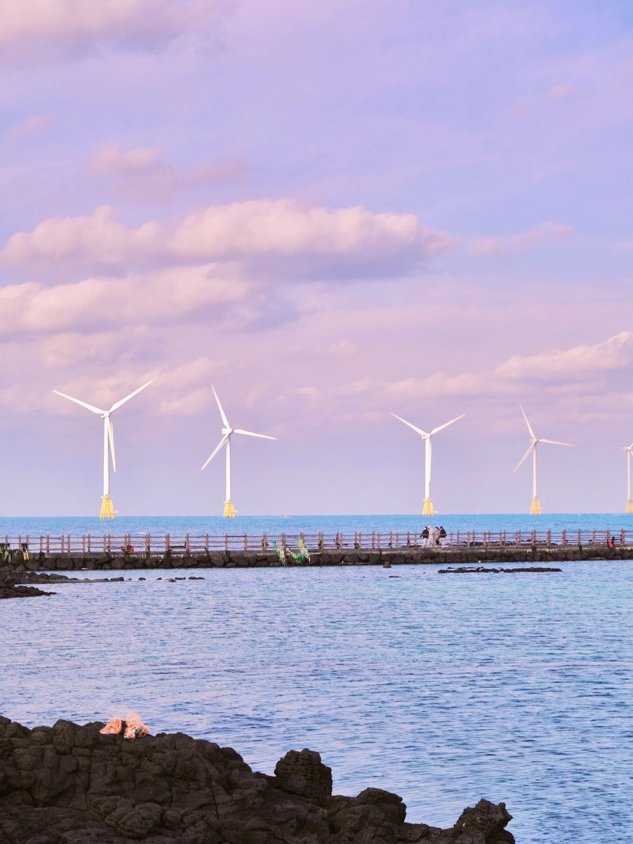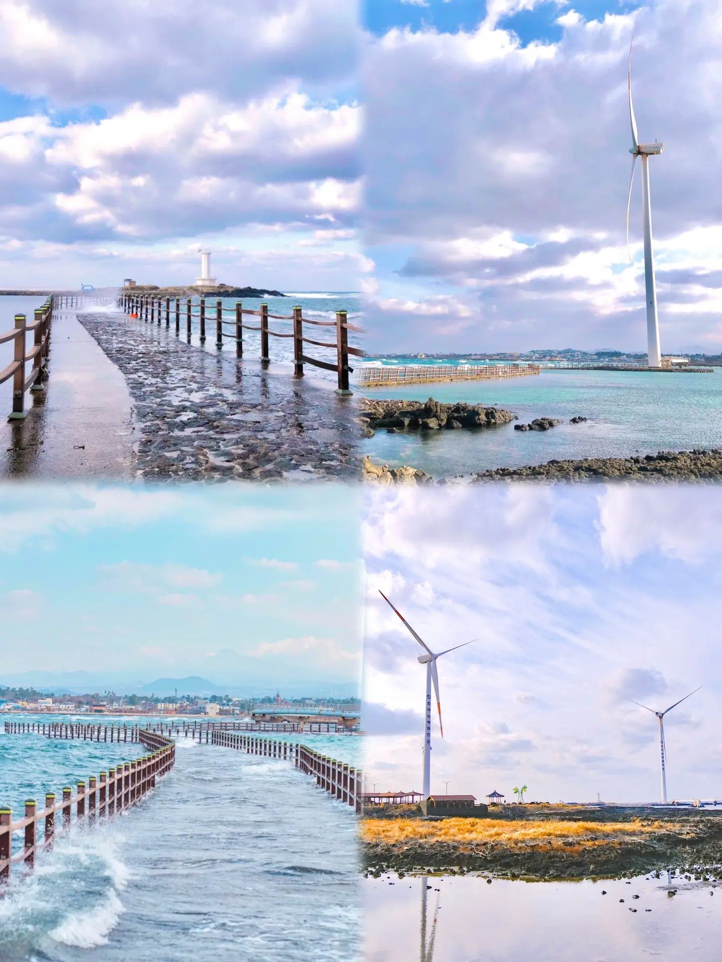 位於濟州島西部海岸,有處非常知名的散步道路「新昌風車海岸道路」,絕美的海岸上有一整排巨大的風力發電車,加上純白的跨海人行陸橋,看起來就像是畫報、雜誌的景色,也深受許多韓劇劇組的喜愛~