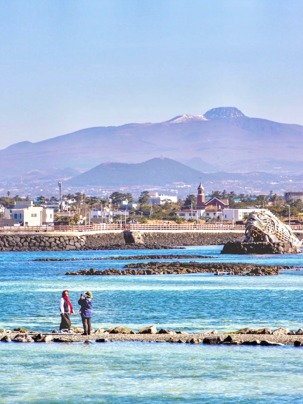 濟州島沿海都有許多深黑色玄武岩散落形成特殊的景觀構造,另外在跨海人行路橋旁,遠遠就有座岩石小屋立在海上礁岩上,隨著海水退潮,就像澎湖的摩西分海一樣,讓出了一條海中道路,宛如神隱少女中的秘密通道般神奇!