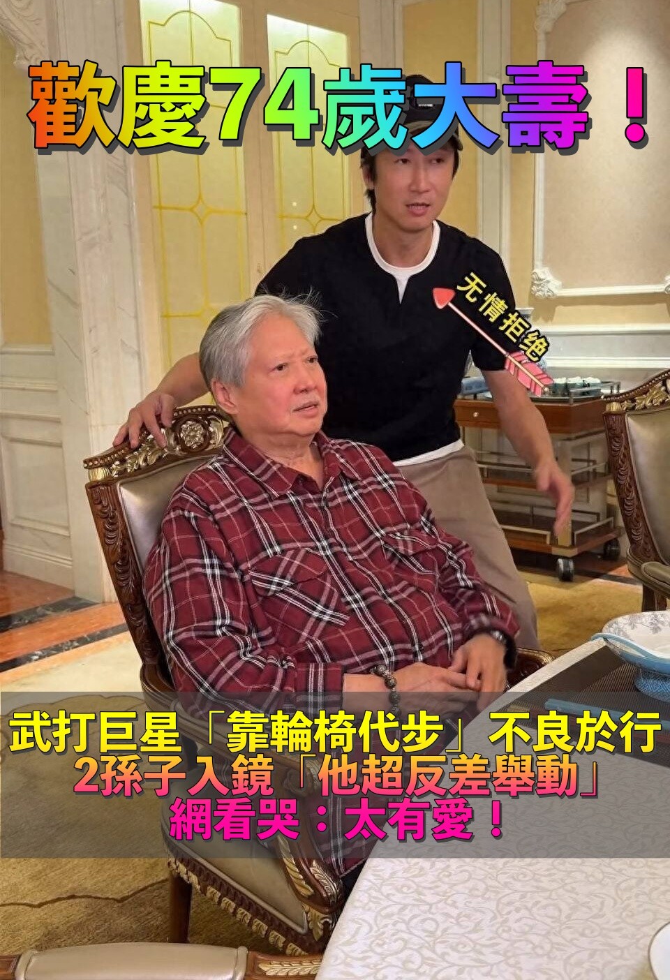 一代武打巨星!歡慶74歲生日「坐輪椅現身」 2孫子入鏡「他坐椅子上奮力舉動」網讚:好有愛