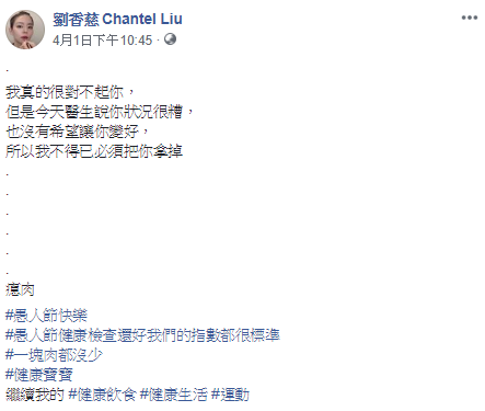不過她也笑說,其實是愚人節玩笑啦,切除瘜肉之後,自己還是健健康康的要粉絲都別再擔心!粉絲得知真相後,也忍不住驚呼:「齁嚇我一跳啦!」、「怎麼可以這樣嚇人~還好沒事就好!」