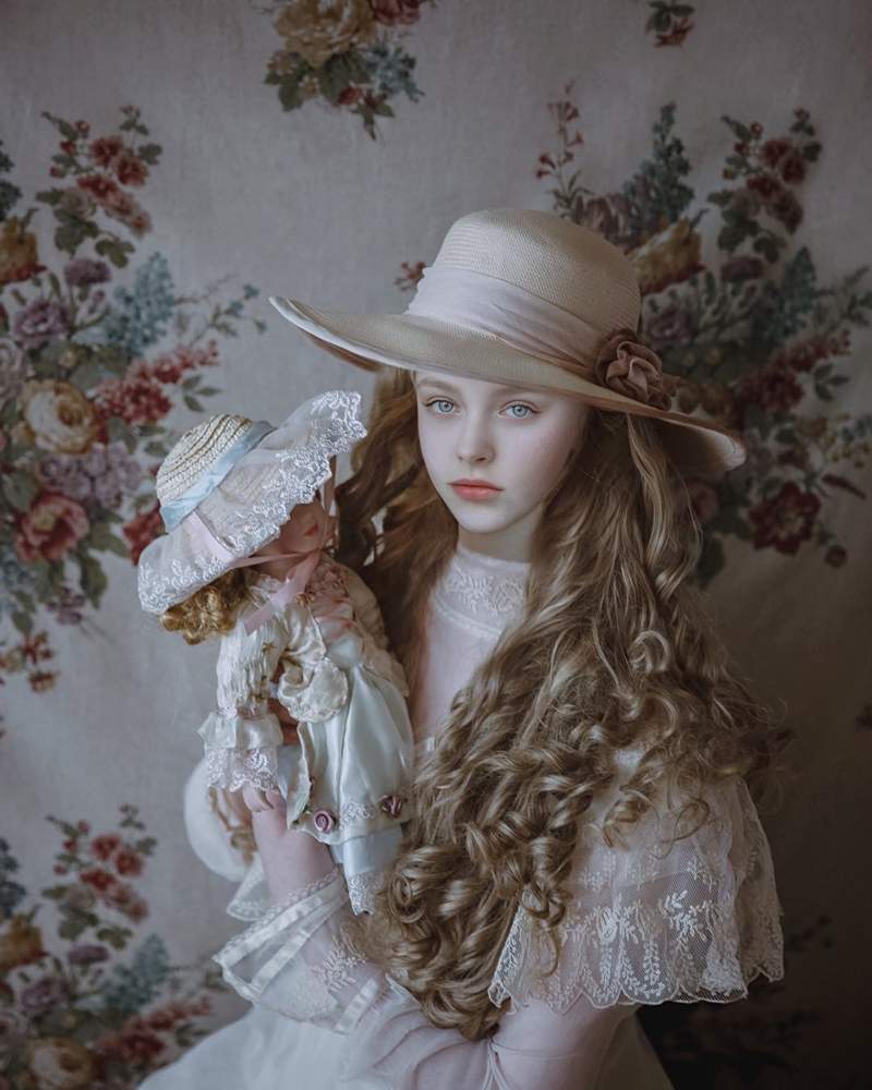 這名女孩是俄羅斯攝影師米拉娜(Milana Angelova)作品中的模特兒,只見她穿著繁複的白色蕾絲洋裝,捲捲的淺棕色頭髮完美垂在胸前,精緻小巧的五官就像天使一樣可愛,讓人不敢相信她是真實存在於世界上的人類!