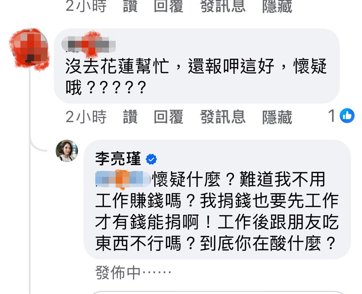 原本只是單純分享與好友相聚的歡樂時光,李亮瑾在社群平台上分享三人享用鹹酥雞的合照,沒想到竟遭到網友留言抨擊質疑:「沒去花蓮幫忙,卻在這邊吃這麼好?」面對這樣的言論攻擊,李亮瑾立即做出強烈回應:「難道我不需要工作賺錢嗎?要捐款幫助他人,也得先有收入才行!下班後和朋友小聚怎麼了?」直言不解網友的酸言酸語究竟有何意義。