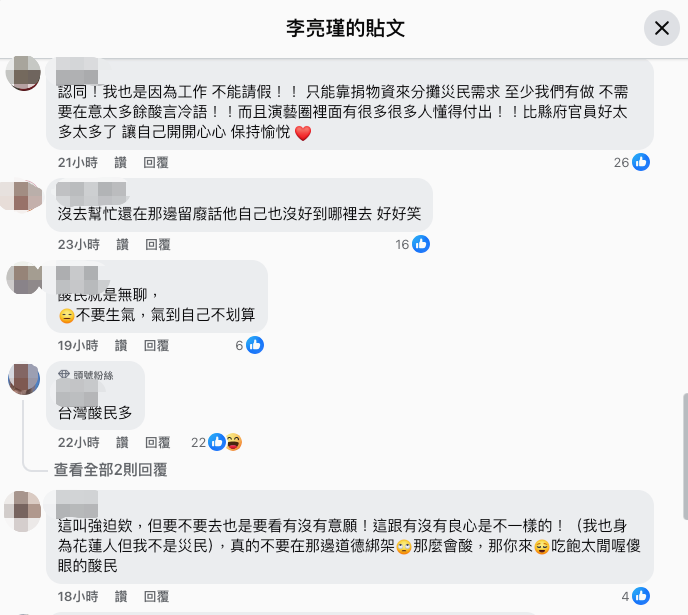 隔天,李亮瑾更將這則留言截圖分享,並撰文表達自己的想法。她表示早就預料會有這樣的評論出現,並強調:「難道一定要po出捐款收據或是親自前往災區才算盡一份心力嗎?每個人都該量力而為,能做到什麼程度完全取決於個人能力與意願。」最後她也建議這些愛批評的網友,不如先關心自己再來指責他人。