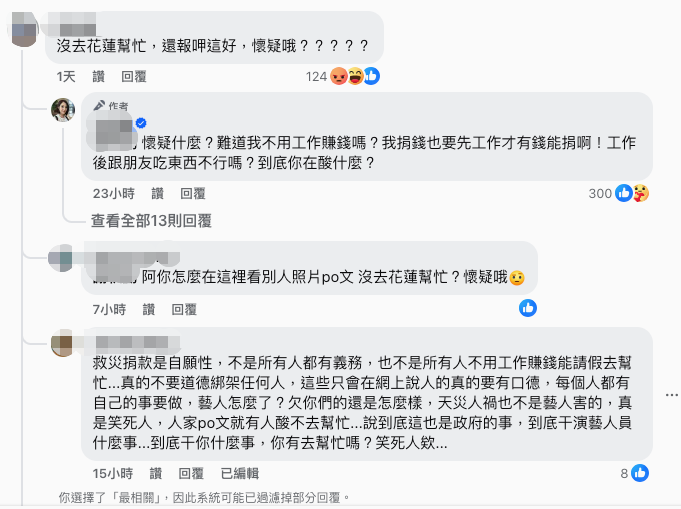 對此,許多網友也幫她抱不平,紛紛留言安慰:「不用理這種人,層次不同!」、「做善本來就是量力而為,不是比賽!」、「不要在那邊道德綁架!幫助人的方式有很多種!」