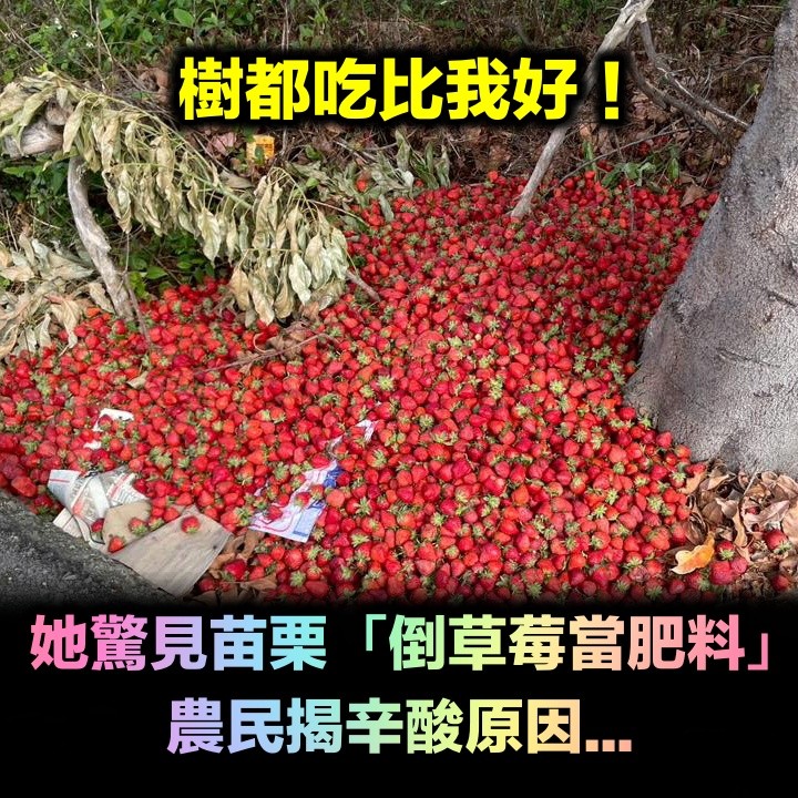 她驚見苗栗「倒草莓當肥料」笑了:樹都吃比我好 農民揭辛酸原因 長腿弟弟 2026-03-18 檢舉 更有蓮霧果農道出心聲「我看了滿滿的無奈,以前老家種蓮霧,賣不出去的都倒掉做堆肥。很多人也問我為什麼不要低價賣,我說送人也沒人要啊,果皮發霉裂果的,送幾次給人吃還可以接受,送多次了人家就不想要了,所以就倒掉做堆肥了」。這番話語道出農民在豐收與耗損之間的兩難處境,也讓外界更理解農業生產背後的艱辛現實。本以為是撿便宜的時候,卻意外得知果農此舉的心酸,真的是一個看天吃飯的行業啊⋯⋯。資料來源:TEEPR亮新聞 Advertisements 回首頁 2/2 Advertisements 編輯精選推薦 More + 44歲許維恩罹乳癌!醫示警「3日常用品」易致癌:別碰才能保命 趕在40歲前閃婚!八點檔女星「宣布嫁給他」 尪驚人身分曝「媒人是柯叔元」 65歲男星獨居暴斃!大咖女星放下恩怨「送前夫最後一程」 昔遭動手6年嘆「死者為大」 台灣人一致認同!國旅「最不想去縣市」第一名出爐 價錢過高「現場又很落漆」:不值得 擦1次窗28元!窮街友「想湊4000元買眼鏡」 挨家挨戶求打工「超商店員一聽突伸手」百萬網友看哭 我帶兒子再婚!對方「也帶了個女兒」後來二婚丈夫也走了 我養大繼女「她上班第一個月遞給我一信封」我淚崩 台語歌后慟別摯愛!告別式上認「早隱瞞病情」 道歉哭喊:原諒我簽放棄急救 弟成植物人、姊猝逝!玉女歌手「遭前夫設套」騙走娘家房產 「狠斬16年婚姻」近況曝 到處都是黑白圖案!藝術家耗費2年「把整棟房子畫滿塗鴉」 用掉2296支筆「空拍照也超驚人」房價暴漲 千萬起家厝賣掉了!張秀卿認手頭緊「為女兒月花20萬」 她超爭氣「進軍美國」成台灣之光 曾比江蕙紅!台語歌后「爆未婚生子」遭指指點點 「2次手術害癱瘓」72歲近況曝 快訊/開全球第一槍!這國家宣布:川普關稅協議「廢止失效」 24歲兒失明!于美人爆「他在飯店掃廁所」維生 不盼紅包只求「別再花我的錢」 快養不起小孩!本土男星「開計程車、斜槓房仲」 突宣布「離開台灣」:演藝圈沒工作 最新/賈靜雯深夜慟曝「她已離世」 淚PO合照喊:真的好愛你... 22歲愛女病逝!資深男星「走不出喪女痛」留白長髮現身 掛骨灰項鍊「代女做1事」惹淚 以為只是小感冒!本土女星悲痛證實「他併發肺炎過世」 一度淚灑現場「後悔同意插管」 功德圓滿了!台語歌后「悲曝他離世」享壽95歲 淚喊:去當快樂的神仙吧... 伊朗總統不忍了!開出「停戰3條件」:美國、以色列不可拒絕 離婚11年!洪榮宏愛女結婚「終破冰前妻」 「2爸爸牽她進場」催淚畫面曝 事業風光情路坎坷!77歲女神「渣夫出軌還求復合」 她單身至今「被偶遇驚天一幕」:根本反人類 登國際時裝周美翻!49歲舒淇「剪掉多年大長髮」 短髮封神「一轉身側面全空」驚艷米蘭 本土劇女星生了!7年前凍卵「終於來到我身邊」 歌手尪嗨喊:生個足球隊 空窗多年!68歲陳美鳳突羞認「身邊有個他」 40年前就認識「遭男方母親拆散」 晚年隱居台東!68歲名主持失蹤「車內身亡」 伴侶悲曝「死前做1事」:還掛念著我