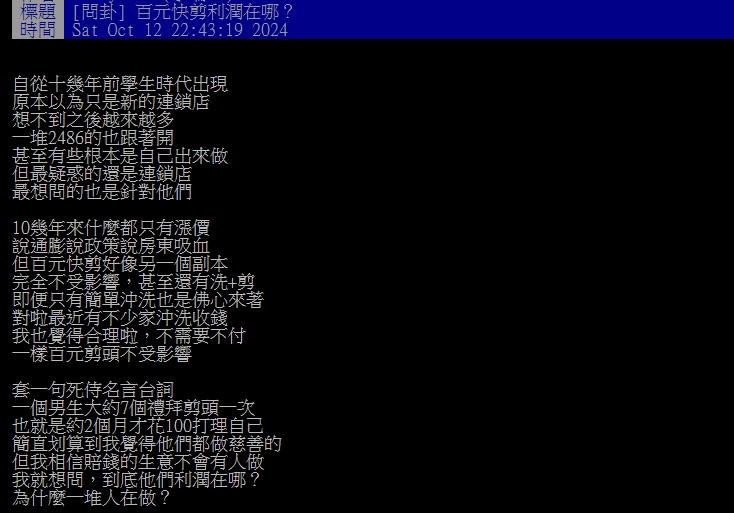 據《ctwant》報導,原PO觀察,10多年前學生時代、就已經有百元快剪,沒想到近幾年如雨後春筍,還有好幾家連鎖店、地位屹立不搖!身為一個男性,兩個月才花百元打理頭髮,「簡直划算到我覺得他們都做慈善?一間連鎖店至少2名店員,就算他們早8晚5、正常上班,剪一個人至少也得10到20分鐘,也不是一直有人,到底?我不懂?有神人能解惑嗎?」