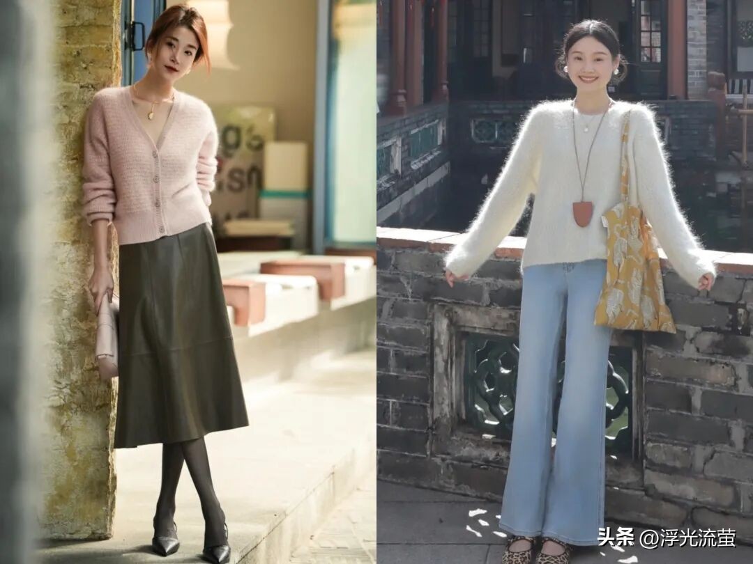 拿上面那位姐妹的穿搭來說的話,一件鵝黃色的V領毛絨長袖,下搭了一條皮質半裙。
