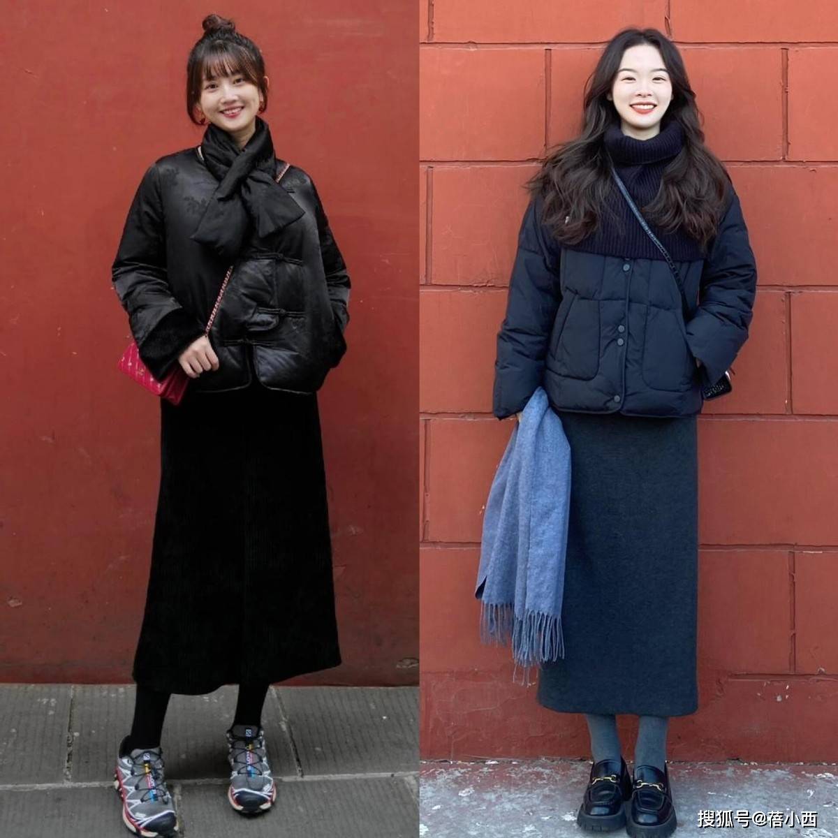 若是想要展現出女人味,可以用黑色羽絨服搭配半身裙,羽絨服選輕薄款,能避免過於蓬鬆,內搭修身針織衫,下裝搭黑色的半身裙,剛好可以形成同色呼應,裙擺長度別太短,到小腿中部最顯瘦遮肉,能恰好露出纖細的腳踝,降低臃腫感。