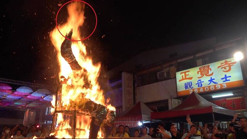 而在祭儀的最後一天,壓軸儀式就是將大士爺的紙神像火化,象徵文化祭的尾聲,在儀式中大士爺像也會在空中畫為觀音菩薩,守護信眾們;不過這次活動中,在火化時竟然真的在半空中拍到觀音菩薩的形象,讓很多人都驚呼不已。從曝光的照片中可以看到,燒化大士爺紙神像的時候,半空中的火焰,明顯化為一尊觀音菩薩的臉龐跟身形,看到的人都覺得是神明顯靈。