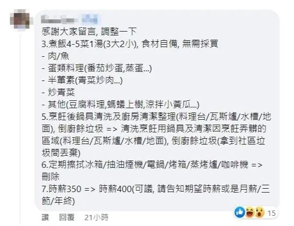 據《三立新聞》報導,原PO在社團「我們是新店人 好山好水 就是愛新店」發文,希望能找到長期配合的煮飯阿姨,條件是周一到週五下午5點到7點,前往家中準備飯菜,不過,要在2小時內準備4至5道菜、加上1湯品,「菜色包括肉(魚)類、蛋類料理(番茄炒蛋、蒸蛋等)、半葷菜、青菜以及小菜,以清淡為主,擅長天然食材及辛香料調味,注重烹飪乾淨衛生。」