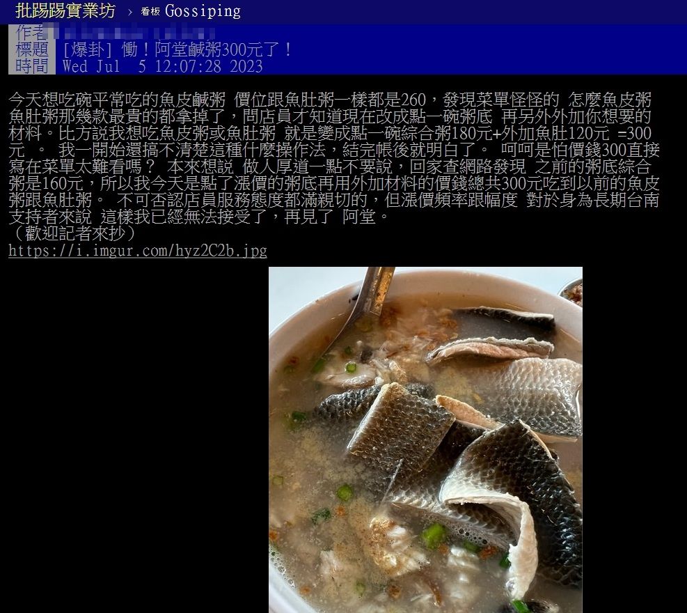 如果知名小吃漲價到一個無法接受的地步,你會選擇繼續買?還是忍痛放棄呢?一名網友昨(5)日表示,中午突然想吃「阿堂鹹粥」,便前去購買。離奇的是,菜單上疑似有被修改過,「怎麼魚皮粥跟魚肚粥那幾款最貴的都拿掉了?」,這讓想吃魚皮鹹粥的他相當困惑,決定前去詢問店員,沒想到卻得到令人無法接受的答案,忍不住怒問,「是怕寫在菜單上太難看嗎?」