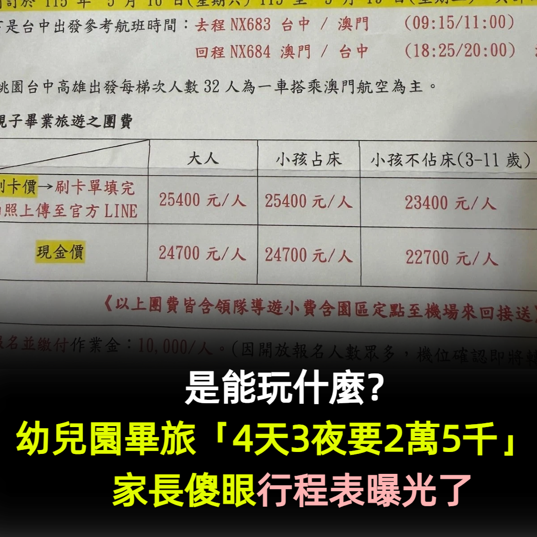是能玩什麼?幼兒園畢旅「4天3夜要2萬5千」家長全傻眼 行程表曝光了