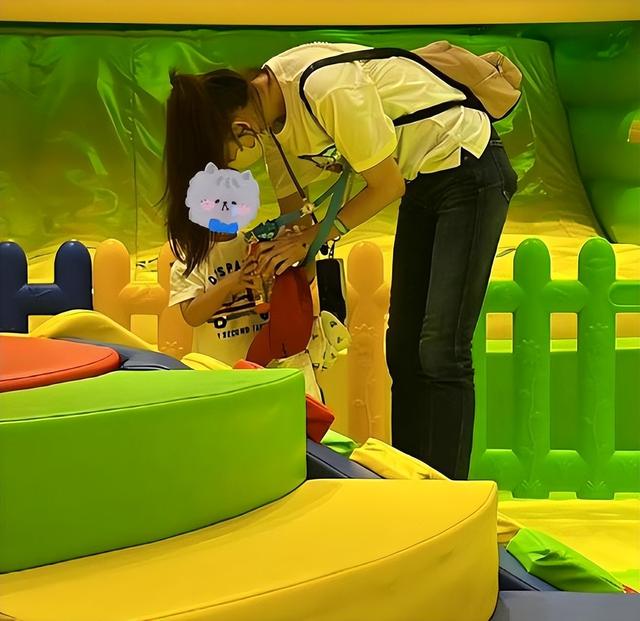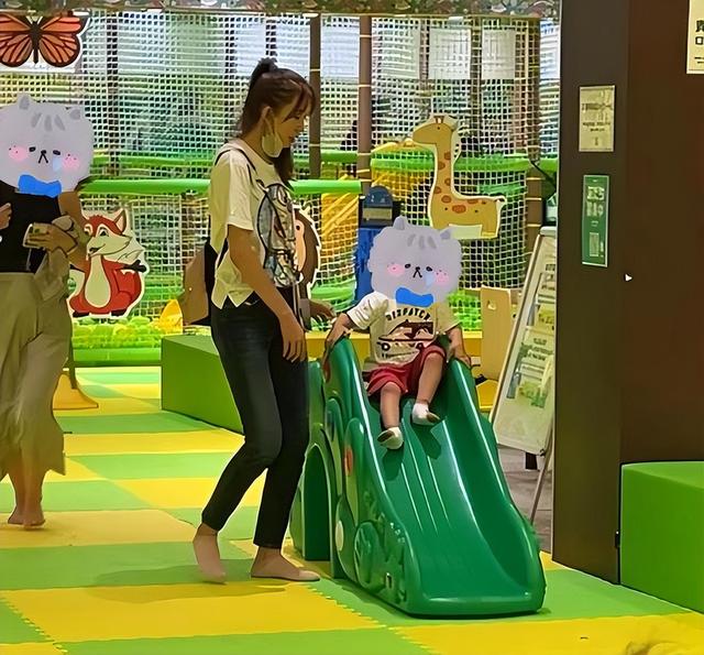陪兒子玩耍,背著兒子的包包和水壺,溫柔媽媽的形象獲得稱讚。
