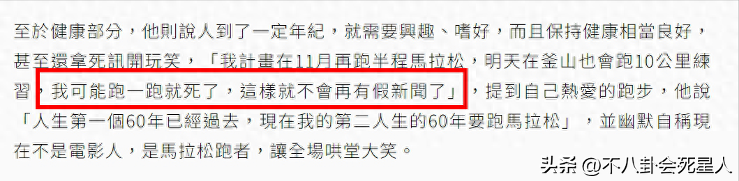 早前網上突然傳出周潤發的「死訊」,令人哭笑不得,但周潤發本人倒是表現得很樂觀。他說自己現在經常在跑步,保不準哪一天跑著跑著就死了,這樣就不是「假新聞」了。